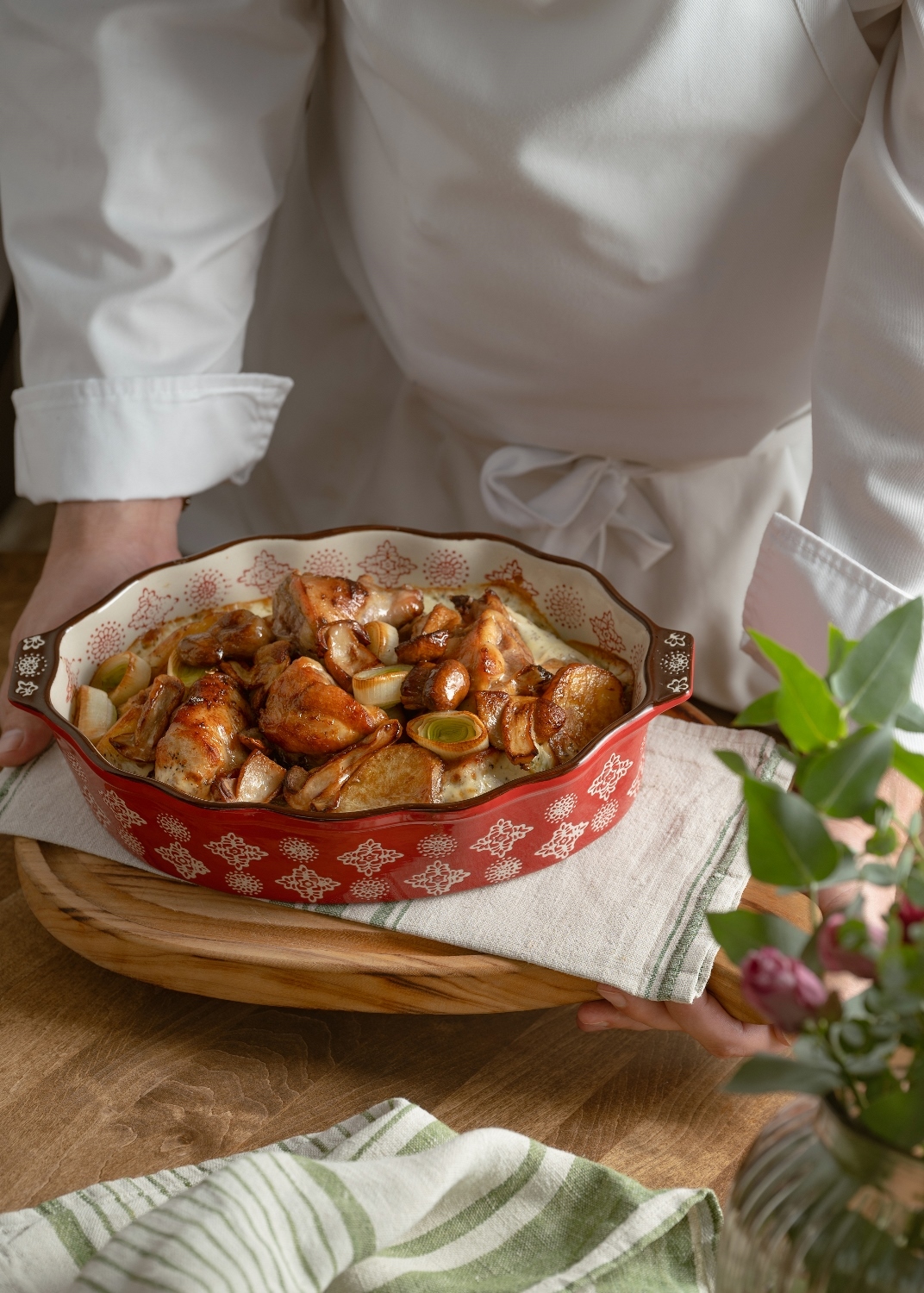 Жульен с грибами и потрошками — классическое французское блюдо с нежным куриным мясом, шампиньонами и ароматными грибами, дополненное золотистым соусом.
